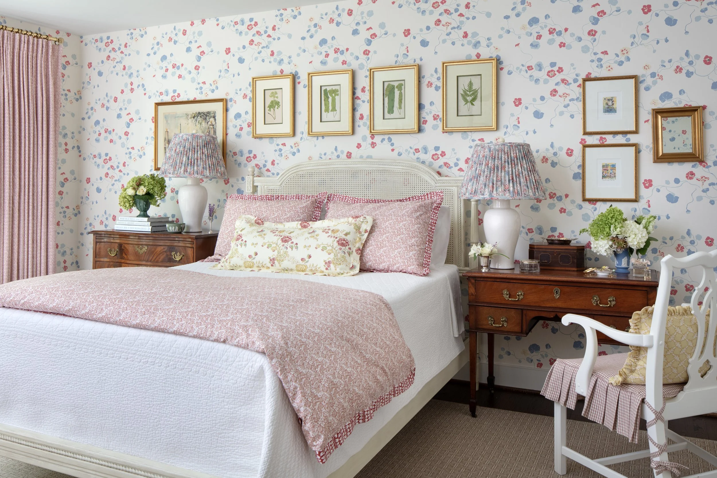 Close-up of a bedroom nightstand with a pink flower in a decorative vase, a stack of books, a watch, and a pink flower in a vase. Part of a bed with white bedding and a floral pillow is visible, along with a framed botanical print on the wall.